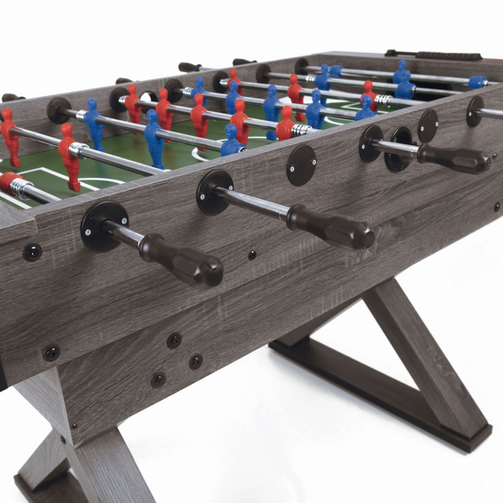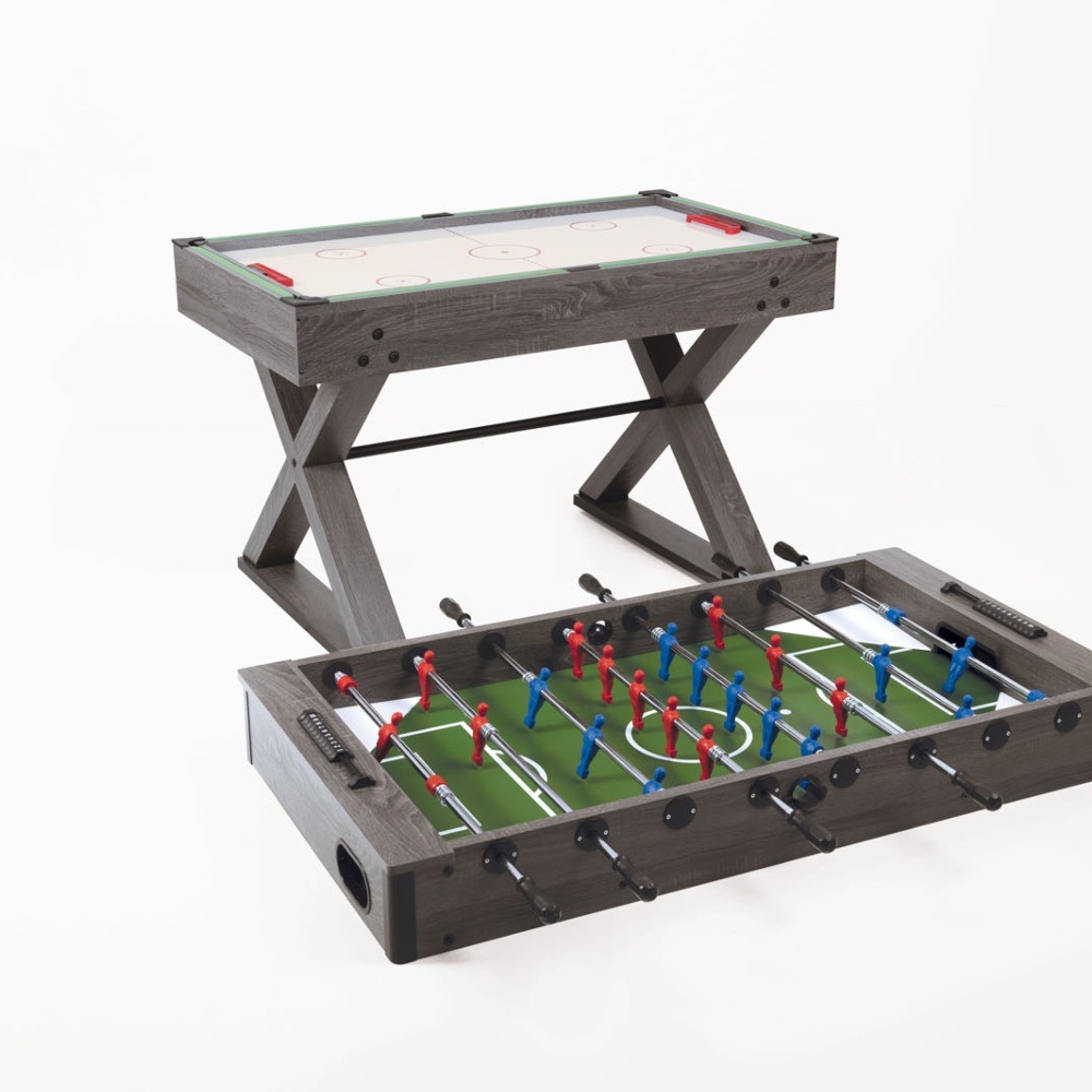 Le robuste gambe a “x” in MDF con rivestimento melaminico color rovere grigio rendono il tavolo stabile anche in fase di gioco