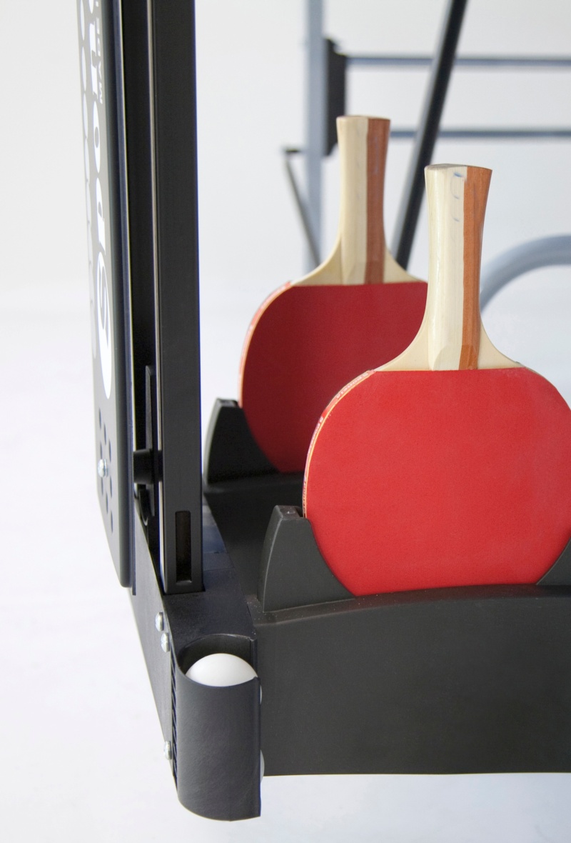 Il dispositivo di chiusura automatica compatta riduce al minimo l'ingombro una volta che il ping pong è piegato, mentre il sistema SMS (Smart Manual System) permette di sbloccare con un solo gesto e nella massima sicurezza i piani del tavolo senza assumere errate posture..