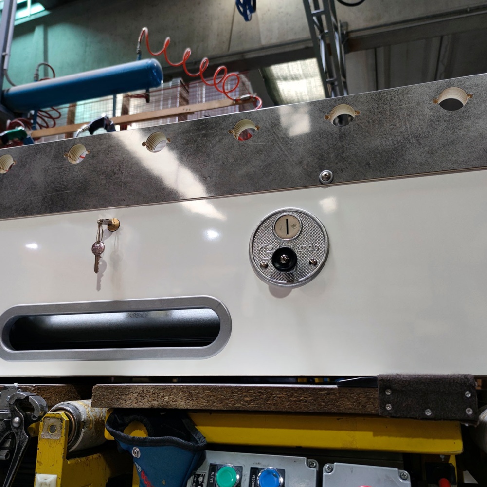 Tutte le parti (comprese quelle in legno) sono assemblate senza l’uso di colle, per permettere facili e veloci sostituzioni di pezzi di ricambio. Il mobile è inoltre dotato di un braccio metallico che ne sostiene la parte superiore quando questa è alzata per consentire l’accesso all’interno, rendendo più agevole il recupero degli incassi e garantendo nel contempo la sicurezza dell’operatore.