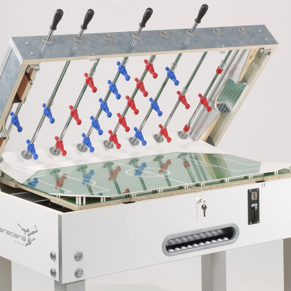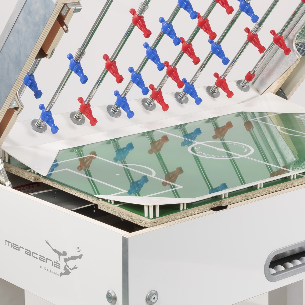 Chi ha detto che l'eleganza è riservata ai modelli da casa e che un calciobalilla da bar deve essere necessariamente spartano? Maracanà White coniuga la raffinatezza del mobile bianco e grigio spazzolato, dai dettagli color silver anziché neri, con tutte le caratteristiche che hanno reso popolare tra gli gli operatori del settore il gemello Maracanà.