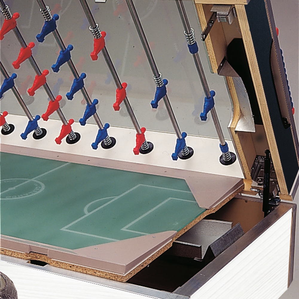Infatti, grazie alla copertura in vetro che isola completamente l’area di gioco, è impossibile qualsiasi tipo di manomissione o interferenza volta a giocare gratuitamente o a prolungare indebitamente l’uso del calciobalilla.