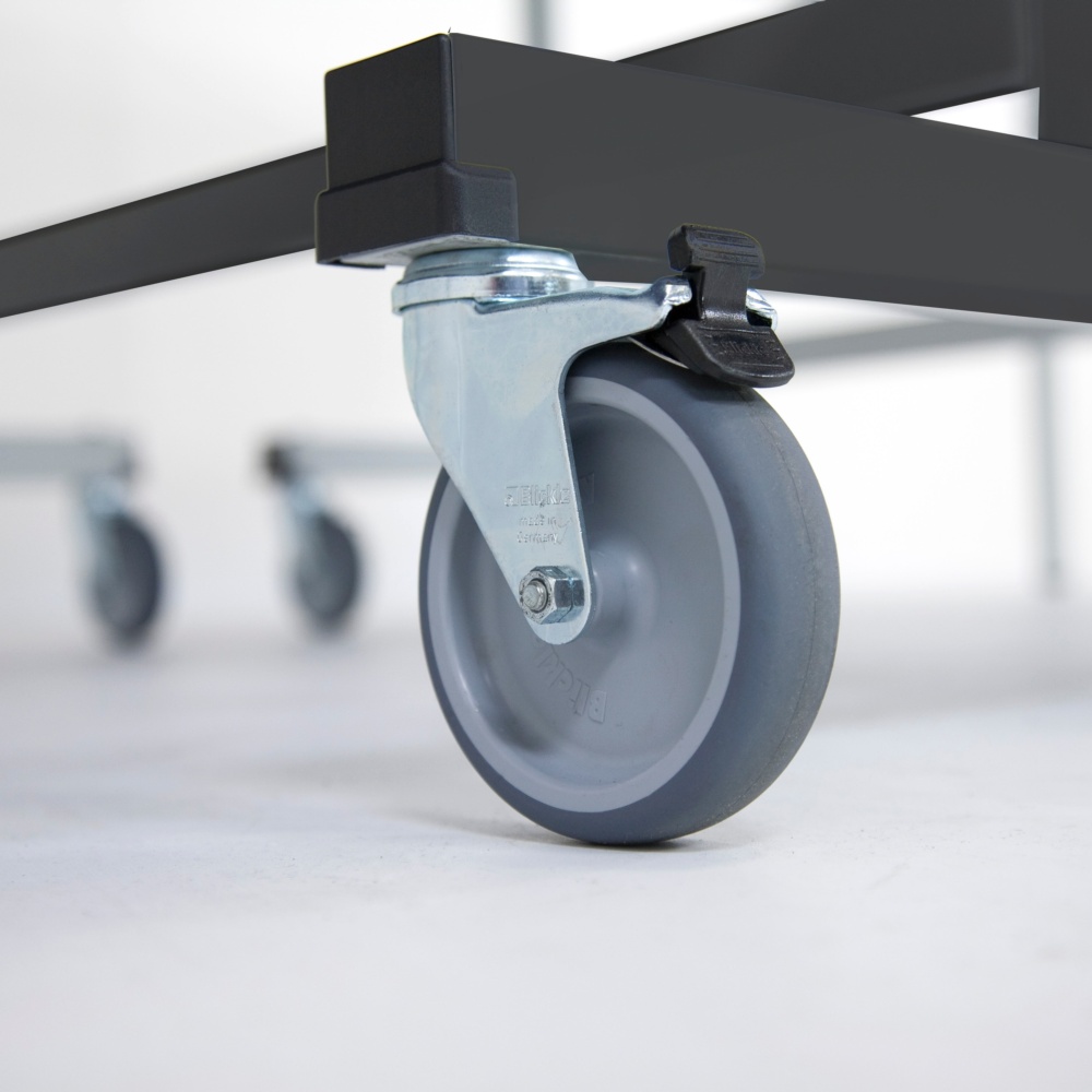 Le otto ruote che ruotano a 360°, quattro delle quali con freno, facilitano lo spostamento.