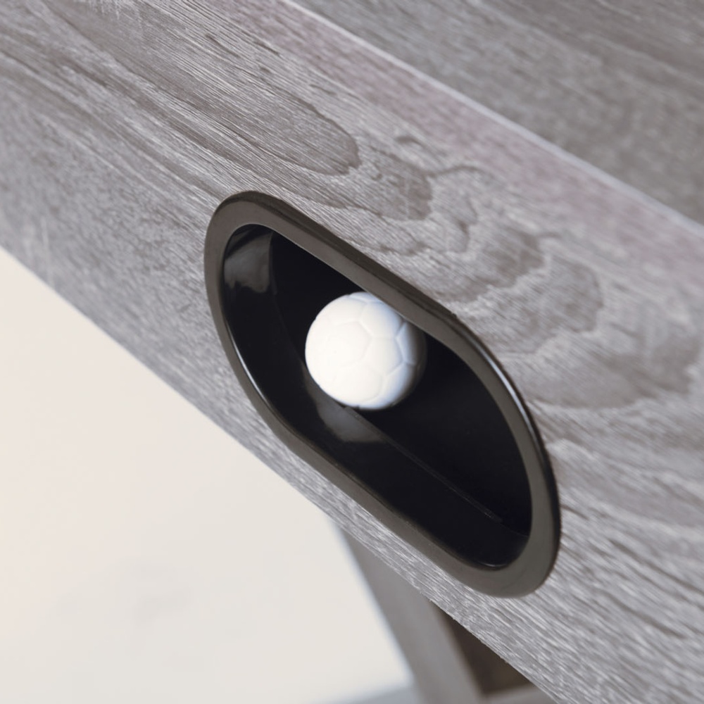 Le robuste gambe a “x” in MDF con rivestimento melaminico color rovere grigio rendono il tavolo stabile anche in fase di gioco